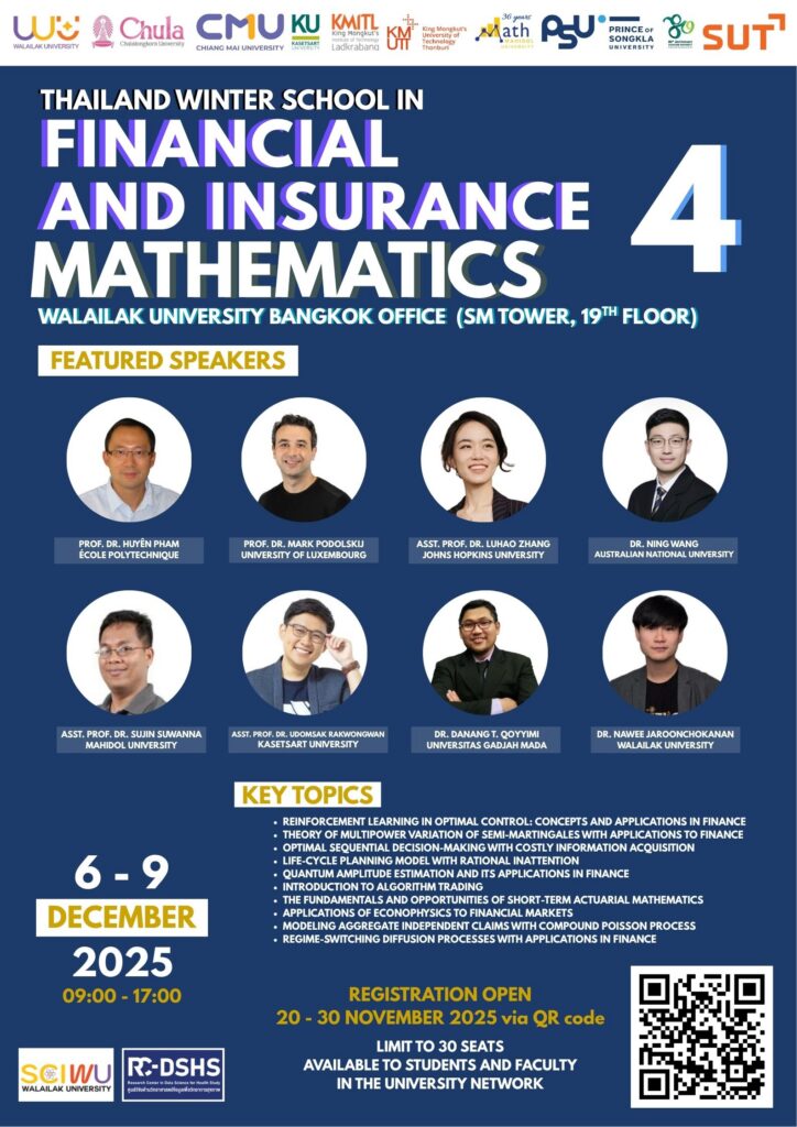 Join us at the Thailand Winter School in Financial and Insurance Mathematics 4, hosted at Walailak University Bangkok Office (SM Tower, 19th Floor).