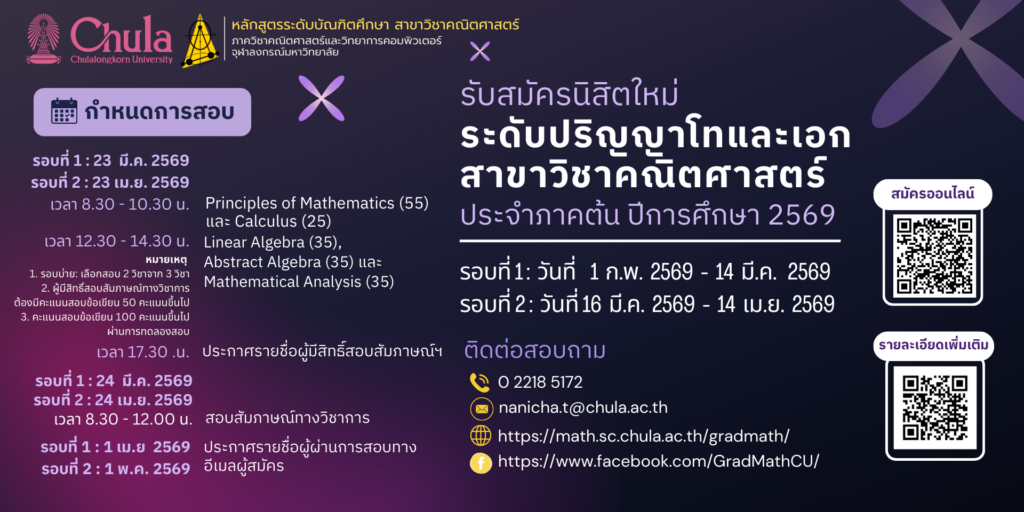 # ดูรายละเอียดเพิ่มเติมได้ที่ https://math.sc.chula.ac.th/wordpress/th-graduate-math/prospective-students/